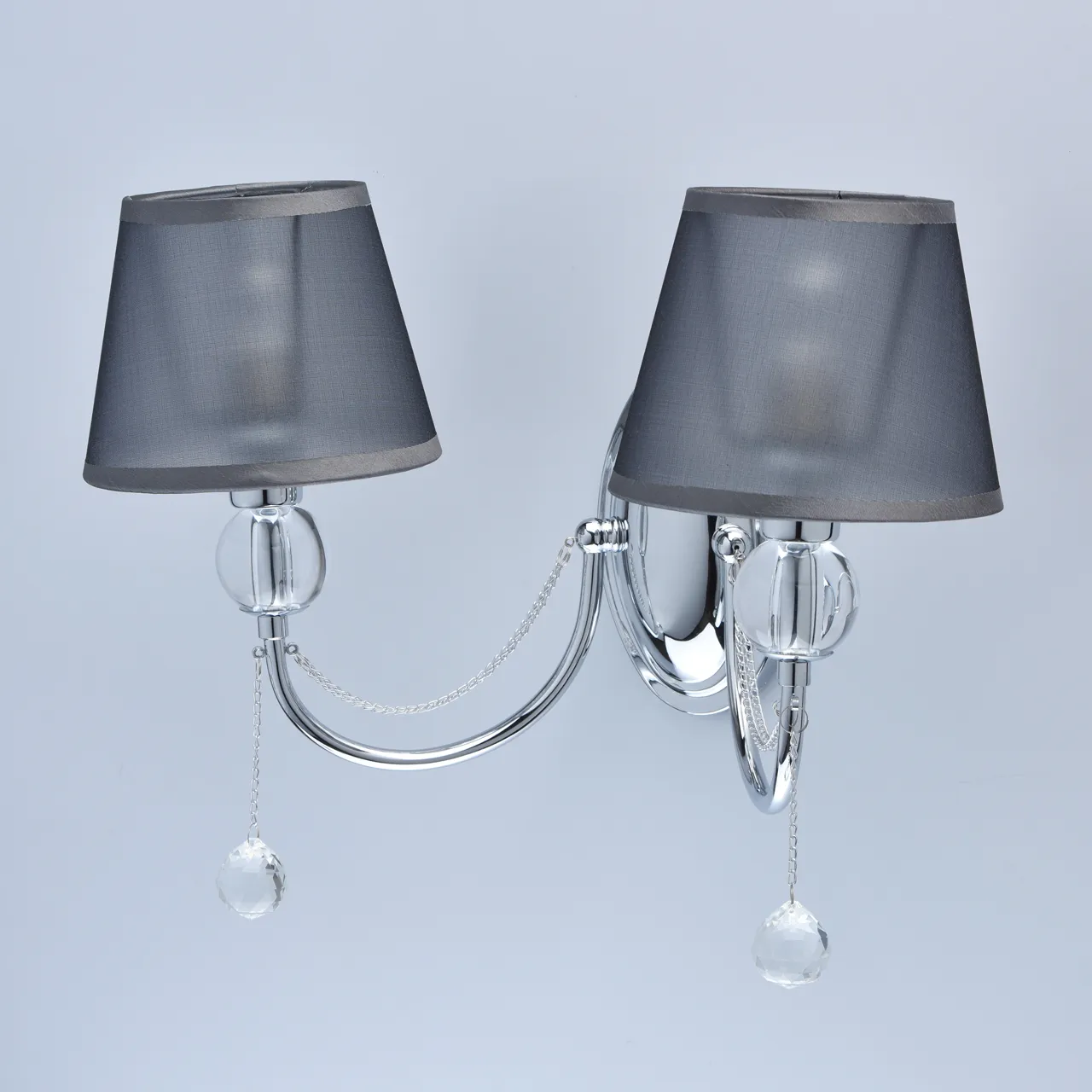 Основание/металл/ хром. Абажур/текстиль/дымчатый. Декор/акрил, хрусталь/прозрачный.