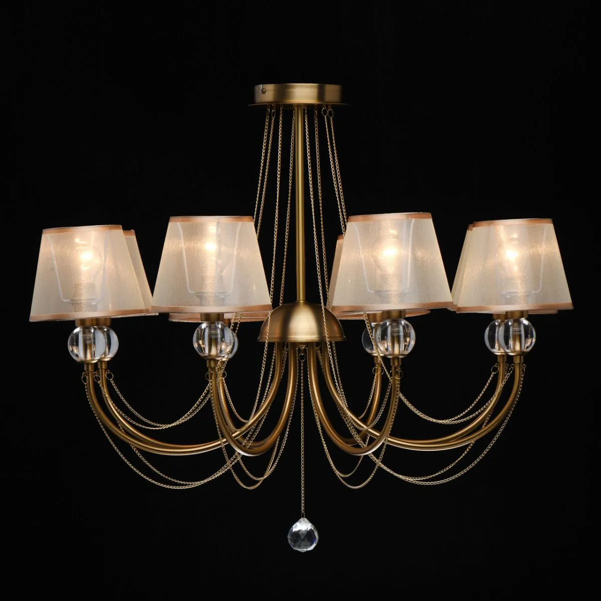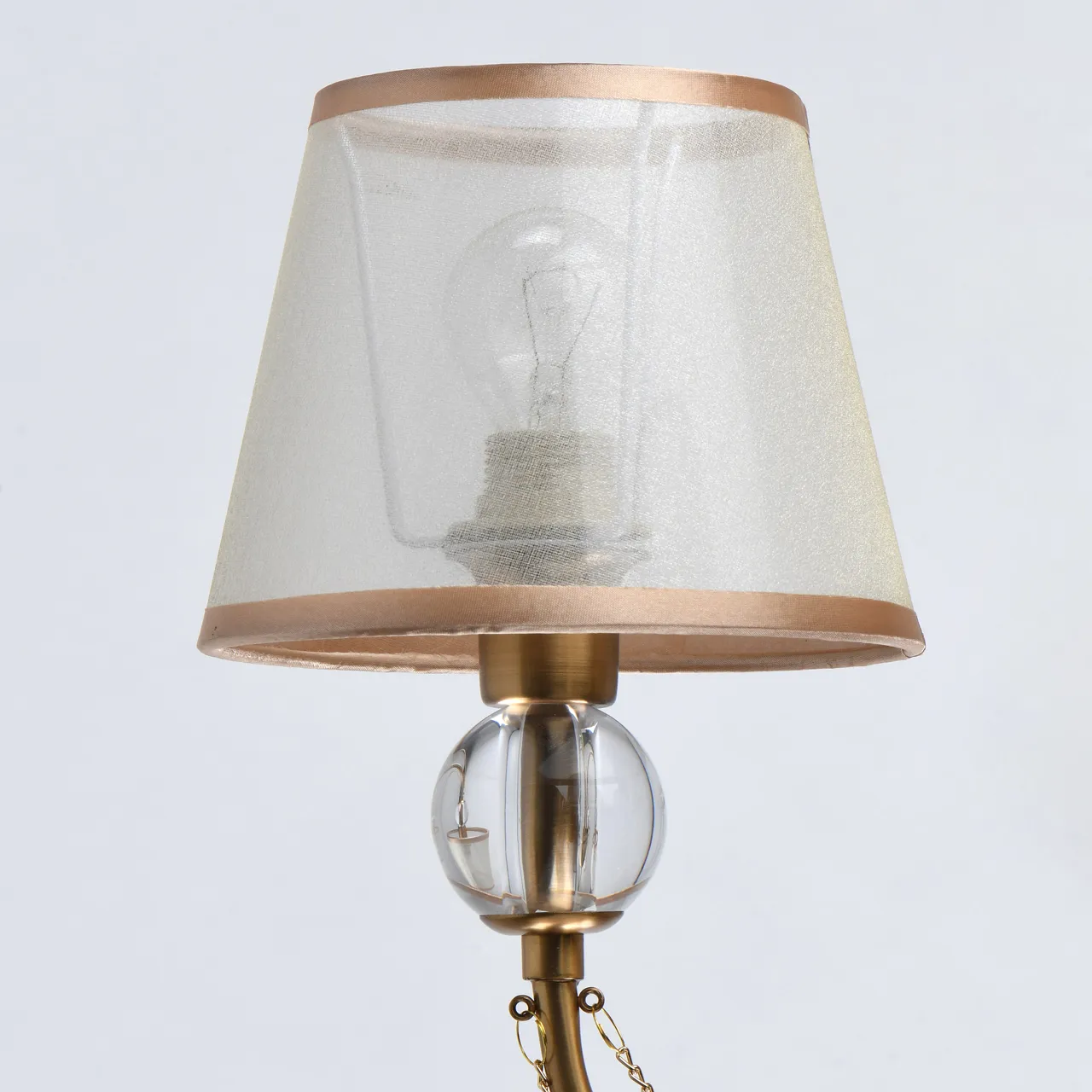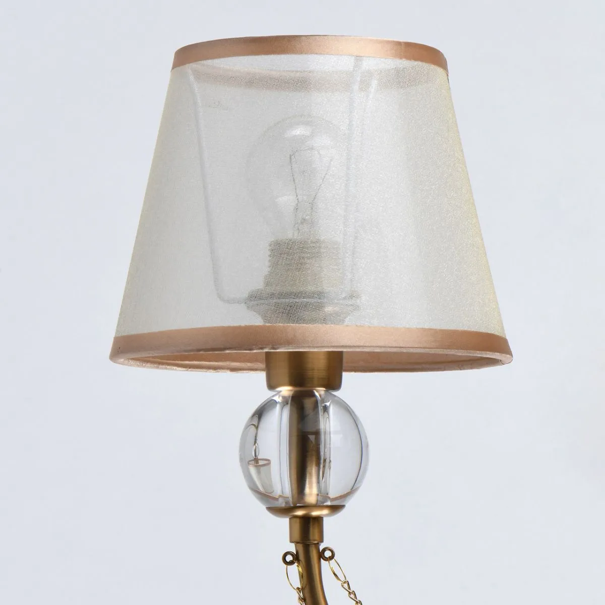 Основание/металл/ матовое золото. Абажур/текстиль/бежевый. Декор/акрил/прозрачный.
