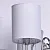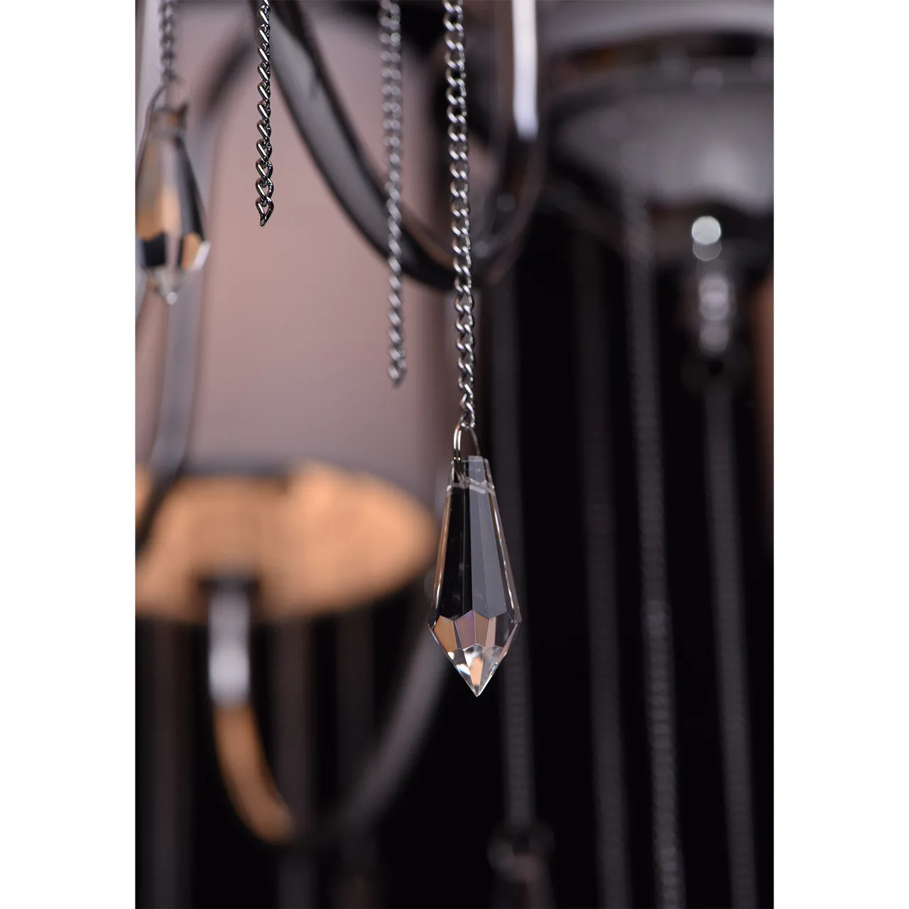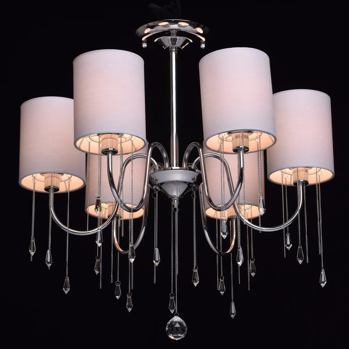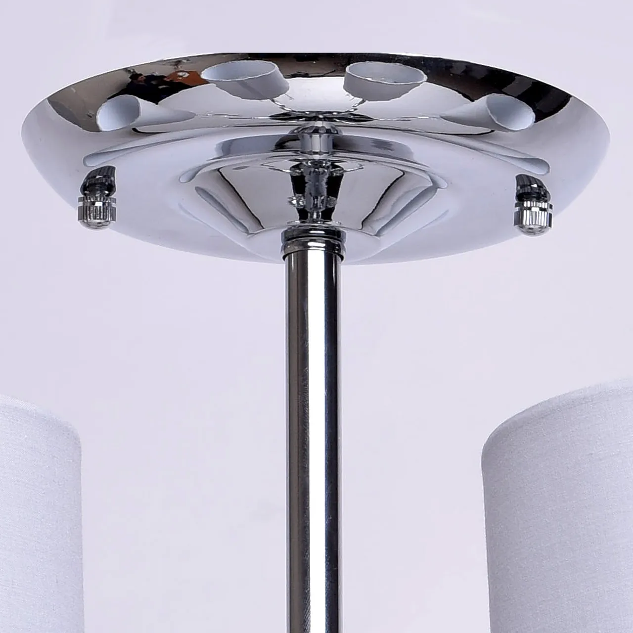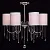 Металлическое основание цвета хрома, текстильные абажуры нежно-серого цвета, декоративные подвески и