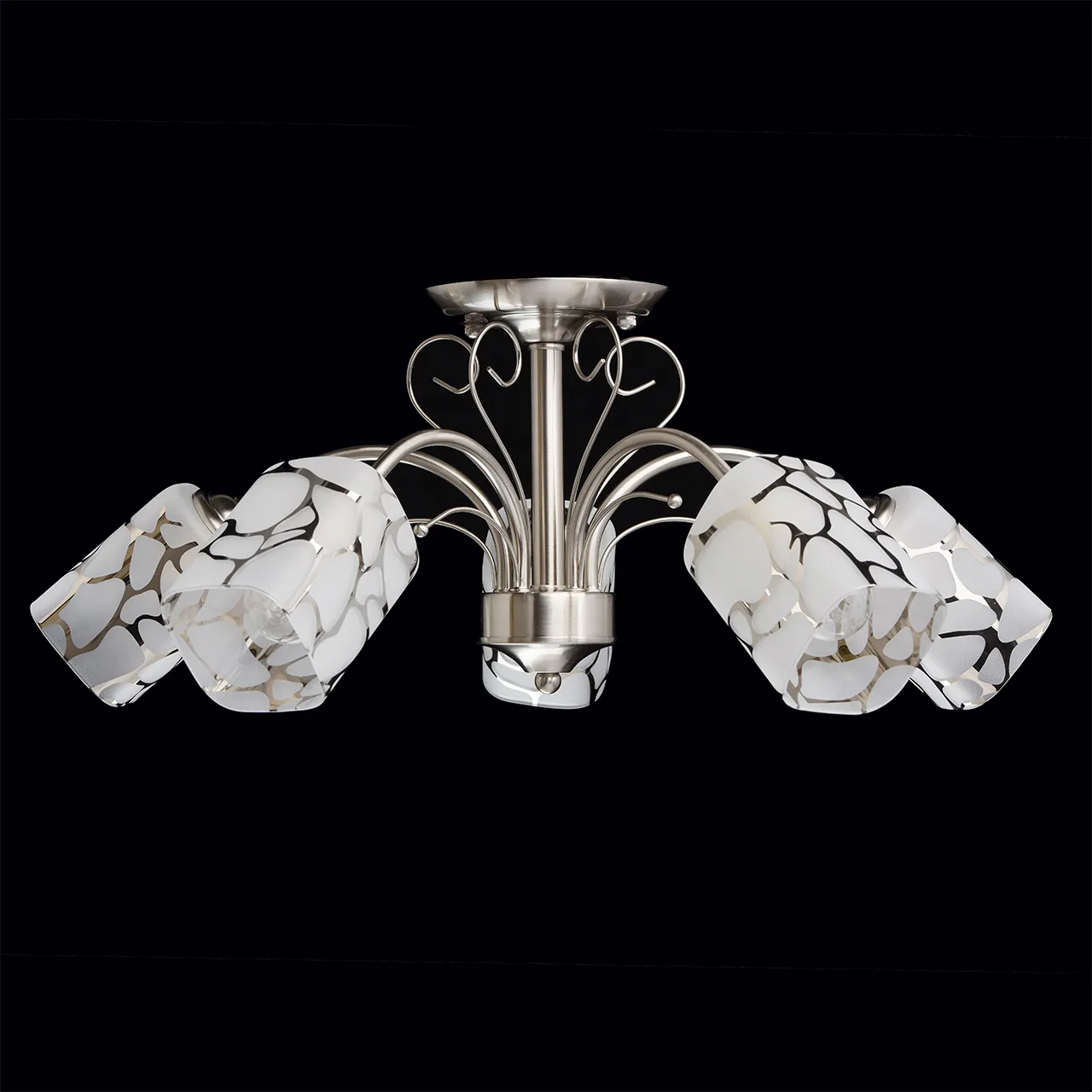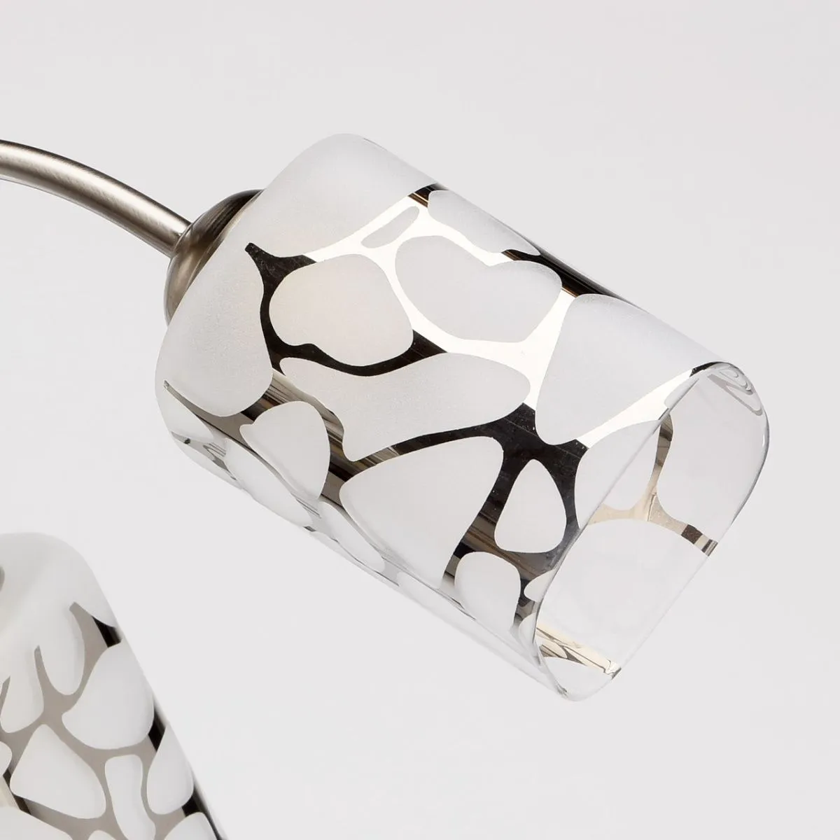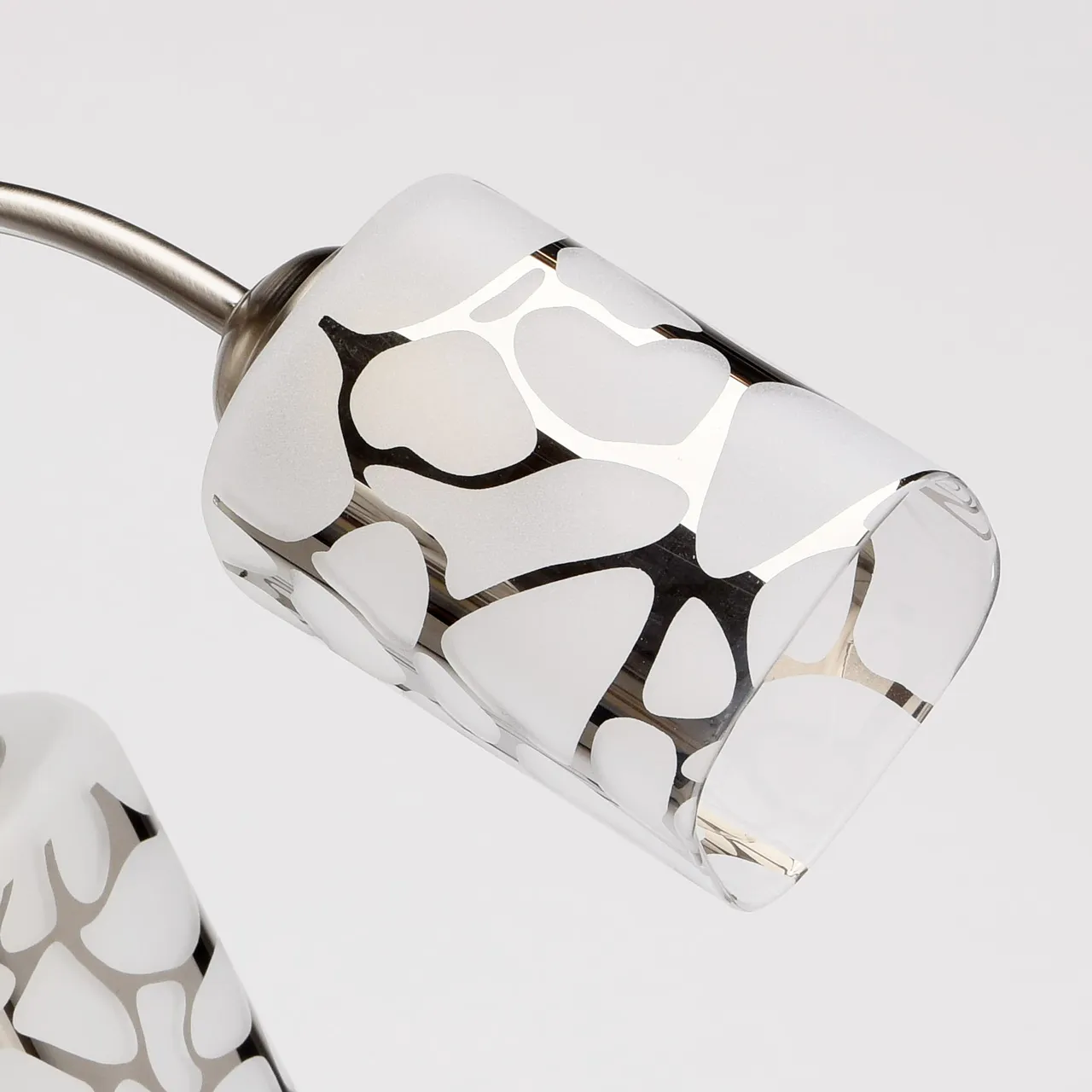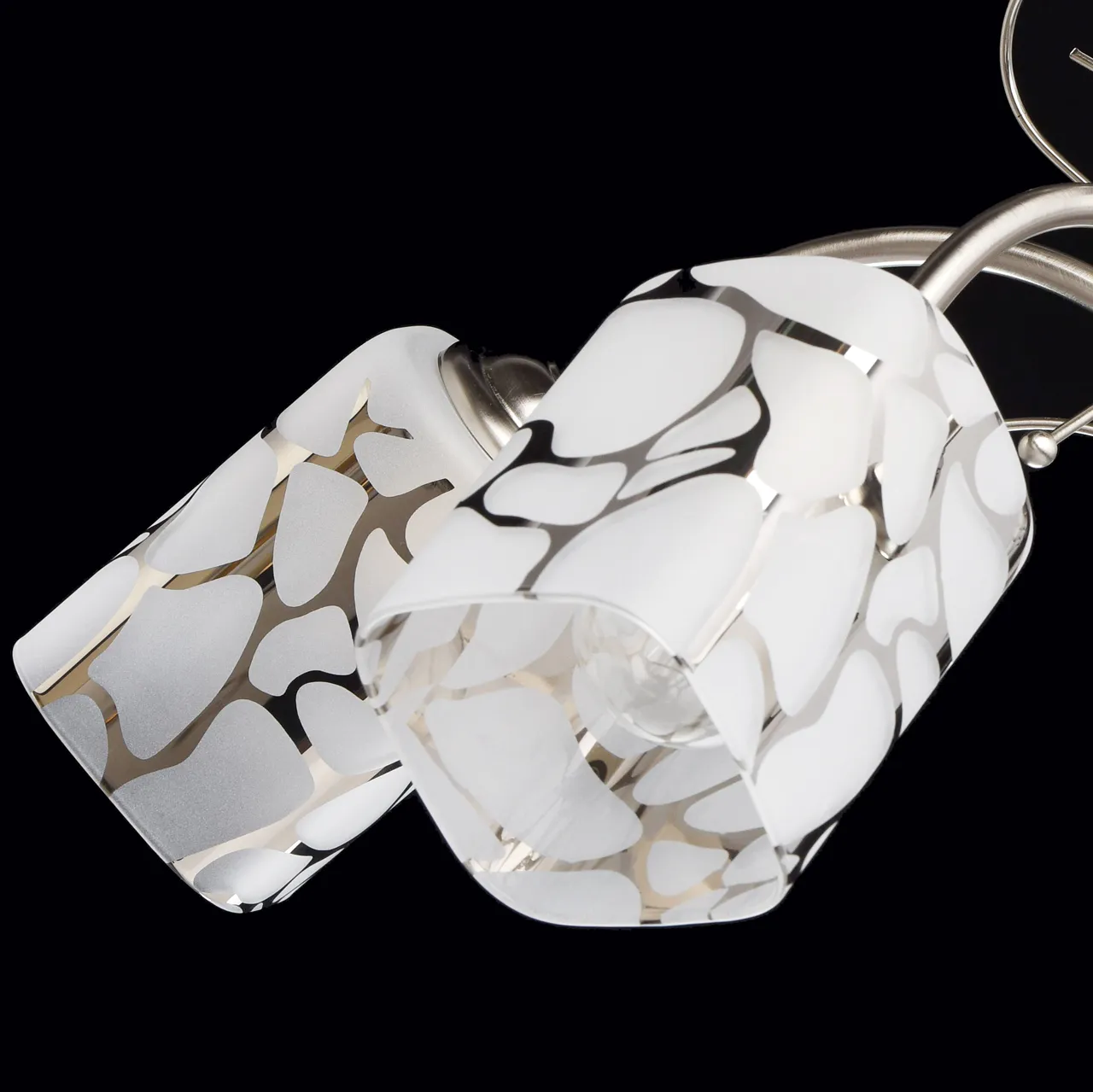 Металлическое основание цвета матового хрома, стеклянные плафоны с гальванизированным рисунком.