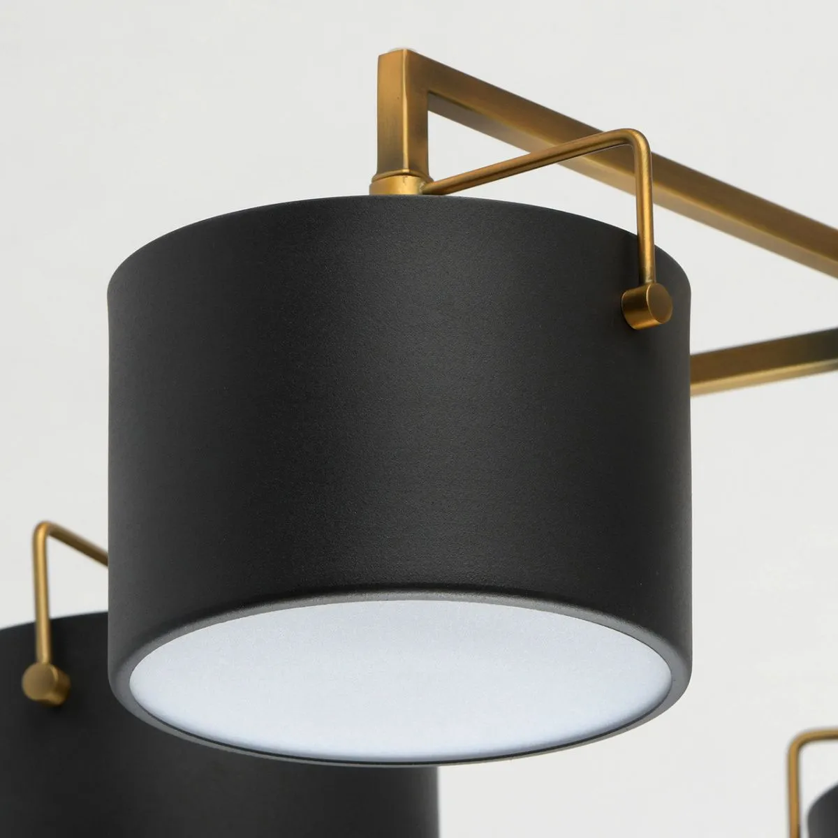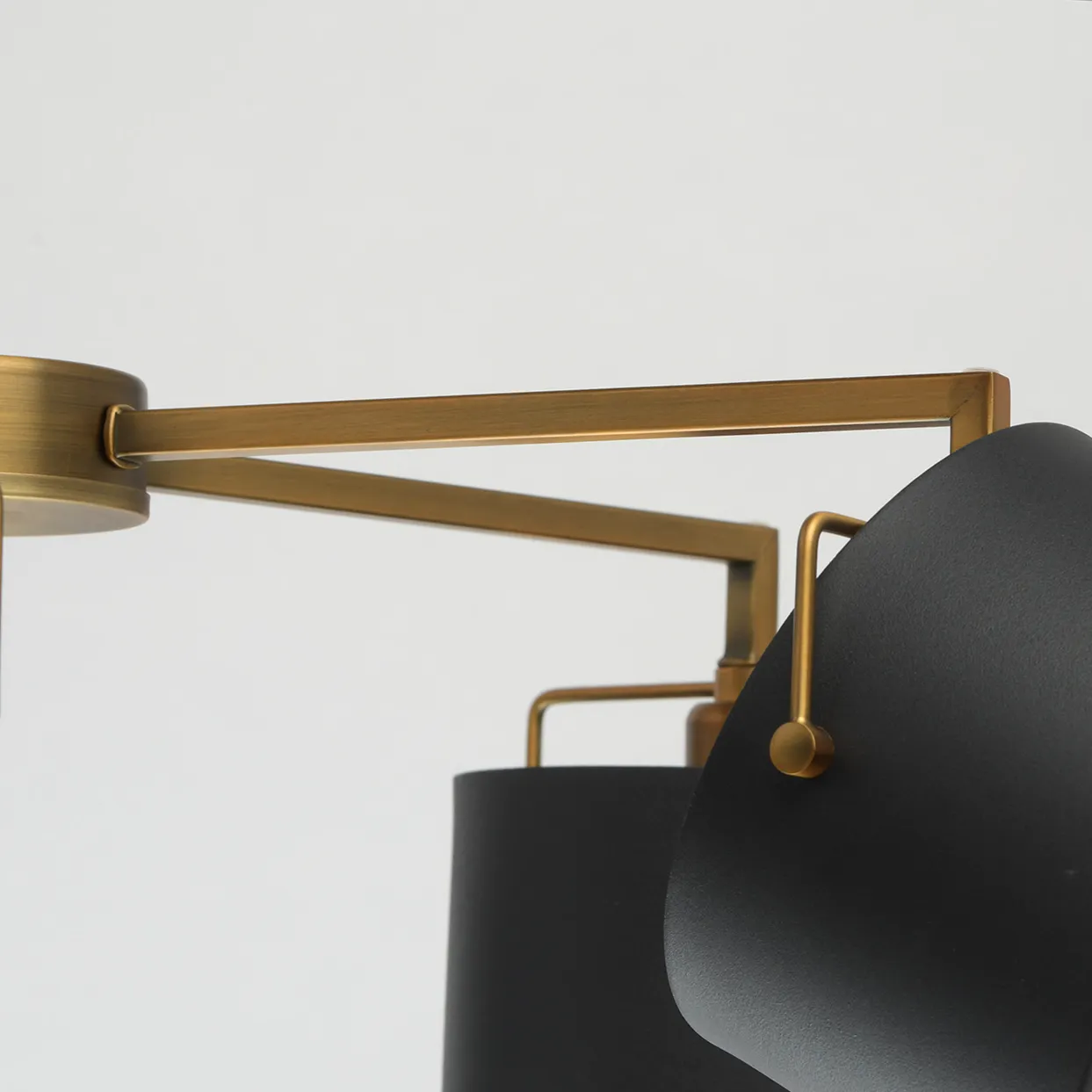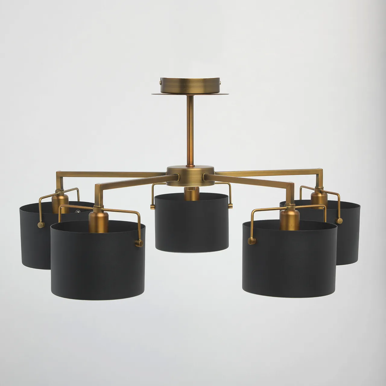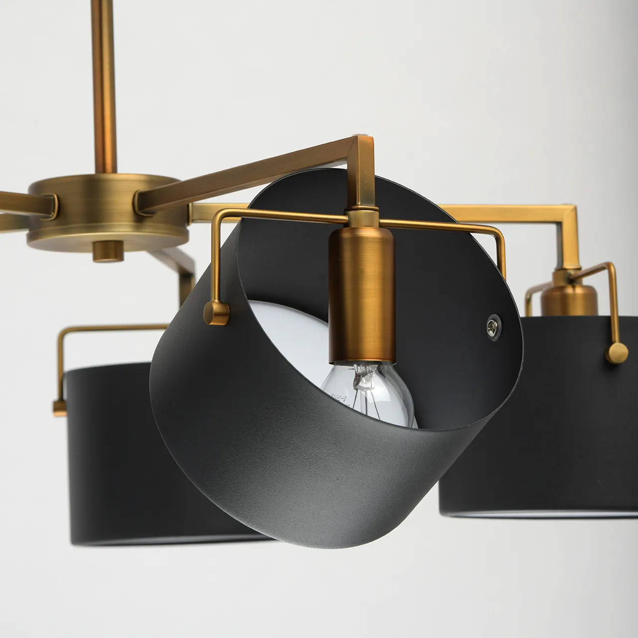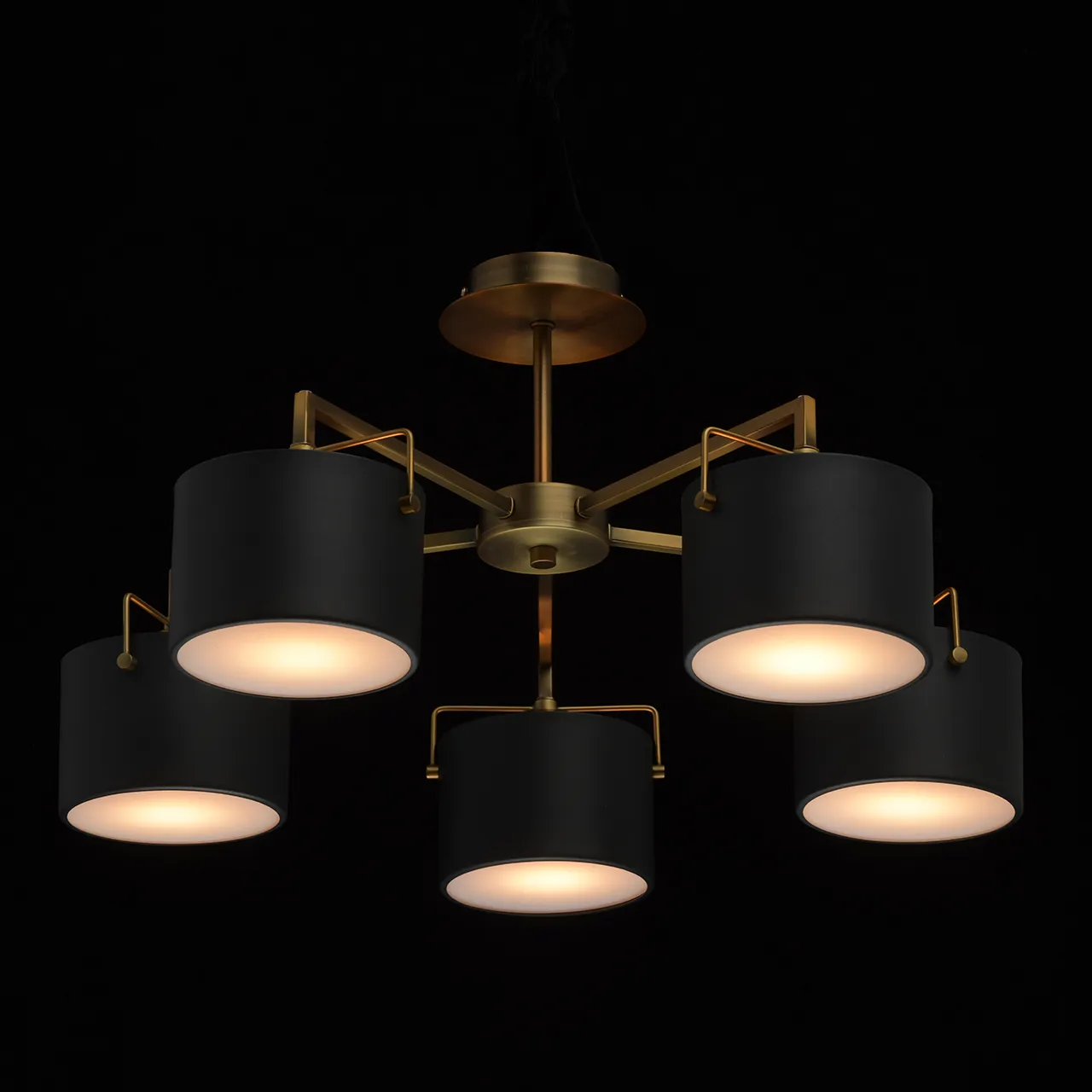 Металлическое основание цвета античной бронзы. Металлические плафоны черного цвета. Матовый акрил.