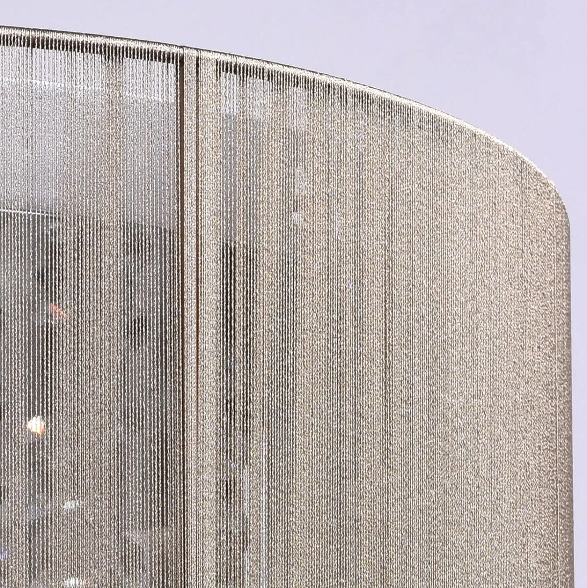 Металлическое основание цвета хрома, абажур, обтянутый тонкими нитями золотого цвета, декоративные э